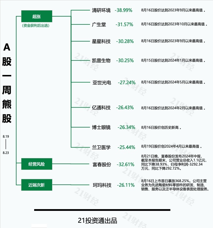 本期十大熊股中,清研环境(301288.SZ)以38.99%的跌幅成为本期的最熊股。富春股份(300299.SZ)、广生堂(300436.SZ)、星星科技(300256.SZ)、凯普生物(300639.SZ)的周跌幅均在30%以上。