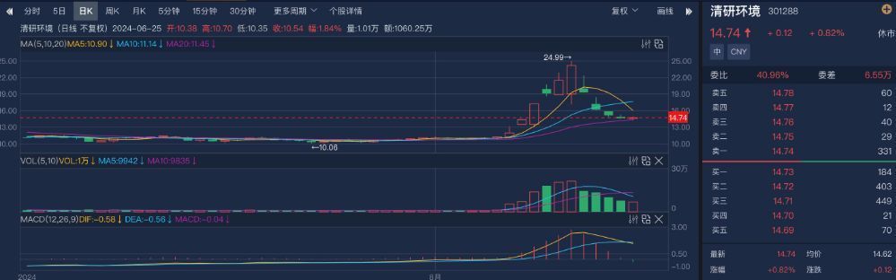 二级市场方面,8月12日—16日,清研环境股价翻倍,累计上涨101.67%。截至8月16日收盘,股价升至24.16元/股。