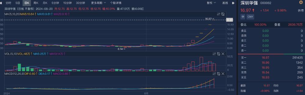 二级市场上,深圳华强近期股价暴涨,其中15日—23日获得7连板。南财金融终端显示, 8月23日公司股价报收16.97元/股,总市值超177亿元。