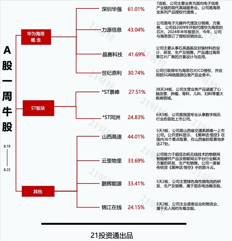 随着大会日期的临近,相关概念股持续发酵。除了深圳华强,本期牛股榜中的力源信息、晶赛科技、世纪鼎利同样属于华为海思概念股。